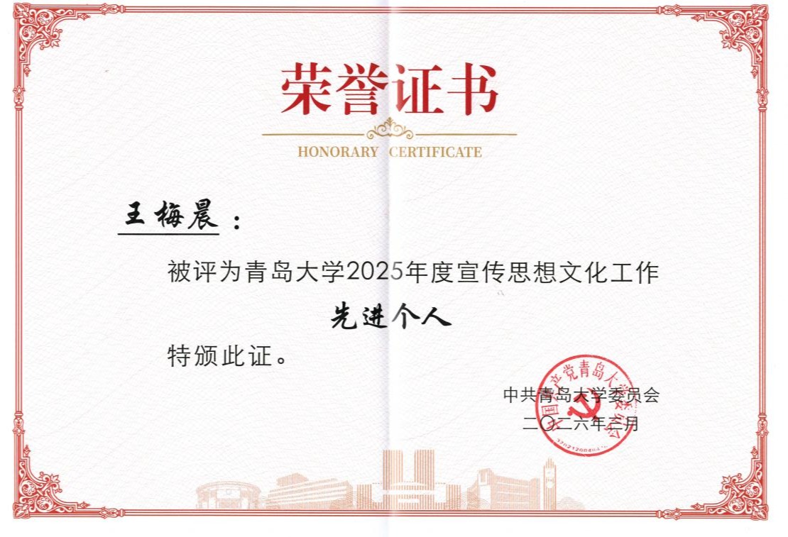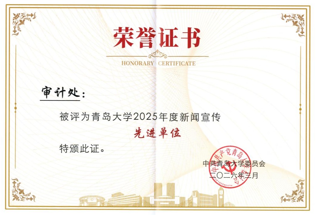 近日,中共青岛大学委员会发布《关于表彰2025年度宣传思想文化工作先进集体及先进个人的决定》,对2025年度在宣传思想文化工作中表现突出的集体和个人予以表彰。审计处荣获2025年度新闻宣传先进单位,一人获评2025年度宣传思想文化工作先进个人。